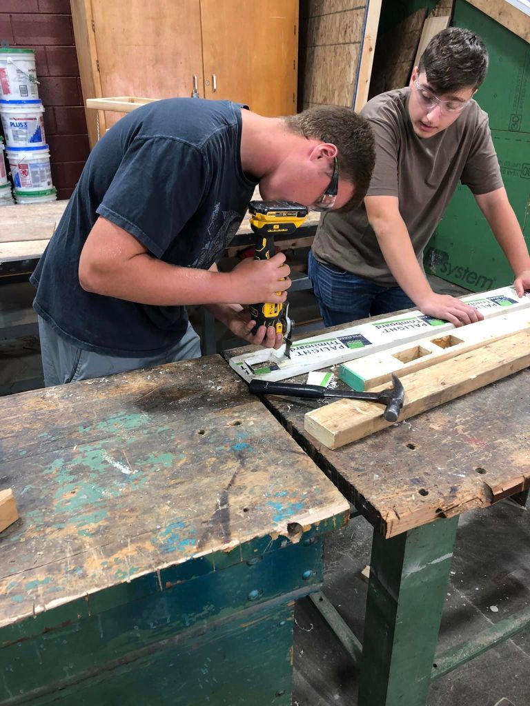One- or two-year program offered to junior and senior students. This course provides experiences related to the construction and maintenance of residential and/or commercial buildings and related fixtures. During the year, students will spend 85% of their time at a job site constructing or remodeling a residential house or commercial building. The other 15% of the time students will be in the classroom. Instruction will include safety principles, framing, plumbing, wiring, roofing, installing insulation, dry wall, pouring concrete, landscaping, estimating materials, blueprint reading, hanging cabinets, siding, hanging doors, heating and air conditioning, masonry, and finish work. Second year students are provided the opportunity to advance their skills in the construction trades.